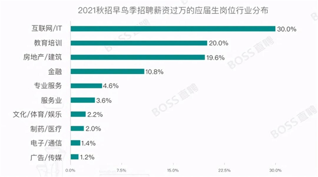 此外,數(shù)據(jù)還顯示,2021 應(yīng)屆生平均月薪為 6812 元,月薪過萬(wàn)的應(yīng)屆生崗位行業(yè)分布,排名的為互聯(lián)網(wǎng)/IT行業(yè),占比30%。如果畢業(yè)生的技術(shù)能力達(dá)到企業(yè)的標(biāo)準(zhǔn),薪資還會(huì)更高。